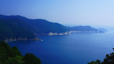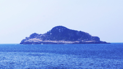 左手前に幸島、右手奥に蒲葵島、背景に沖の島