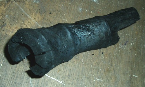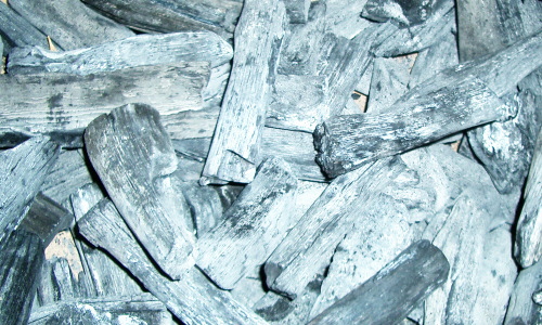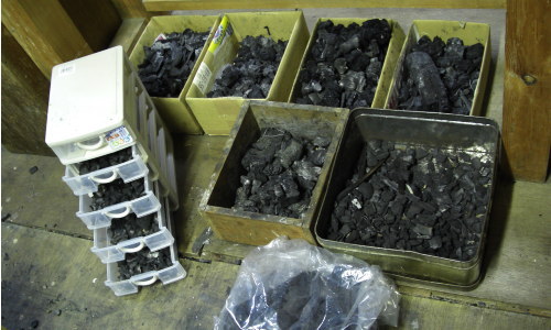 こちらは仕上げの研ぎ出しに使う呂色炭です。材はサルスベリの木などで、炭質はきめが細かく繊細タッチで研ぎ面は滑らかな仕上げになります。