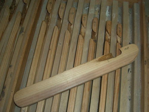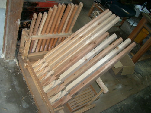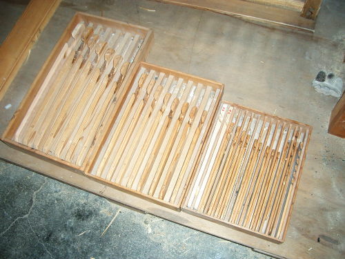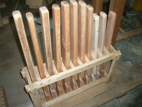 矯め木の材料は、一般的には樫や桜などの堅木が使われますが、当工房では主に杉材を採用しております。杉材は軽量で柔らかな材質なので、竹材とのタッチがソフトな点がお気に入りです。その他、大型の矯め木でも、軽量で扱い易すく又、加工性も非常に良好です。一方、耐久性では堅木に劣りますので、少しずつ手直しをしながら使用しています。