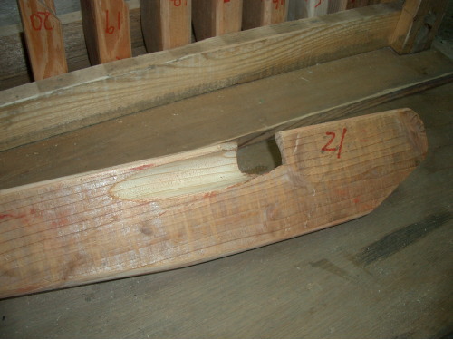 こちらは、大物竿の手元や竿ケース作成用の大型矯め木です。大口径の竹を矯めるのには、力の入り具合が肝要で、矯め木の形状寸法(バランス)には工夫が必要であり、何度か作り直しをしています。