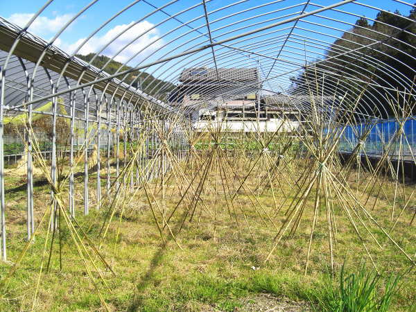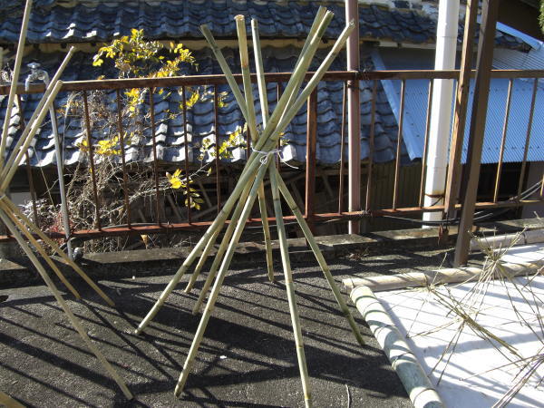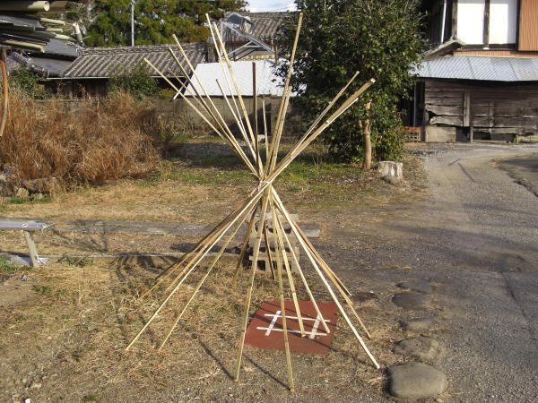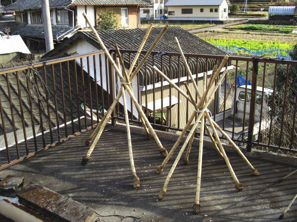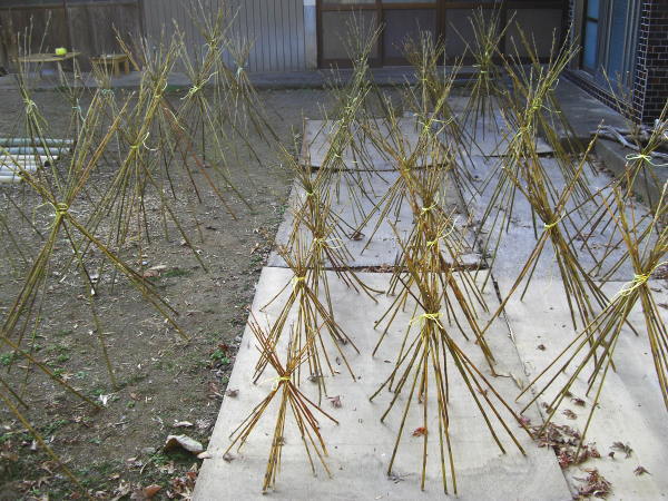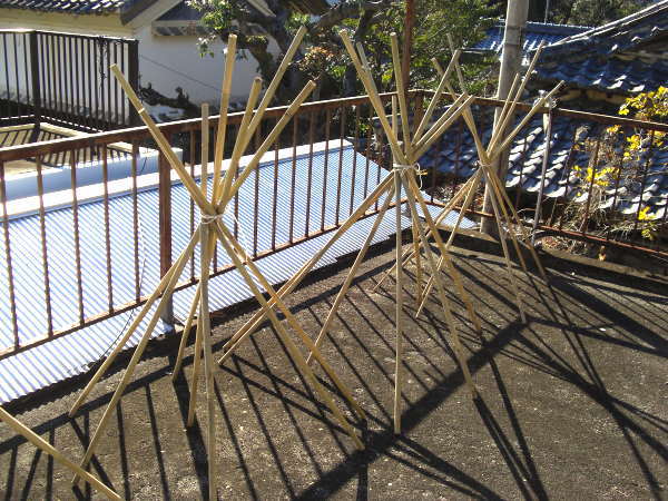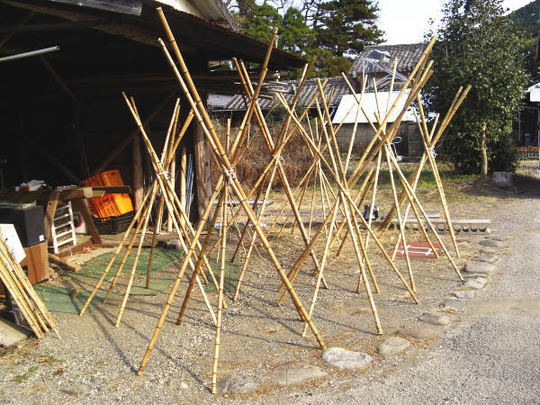 こちらは、淡竹の手元材の竹干しです。淡竹や布袋竹の天日干し期間は、干し過ぎますと後々割れ易くなりますので、1ヶ月余りにしています。青味が抜け次第、適宜、吹き通しの小屋での影干しに移行して、4月中旬頃までには、倉庫に格納して長期保存します。