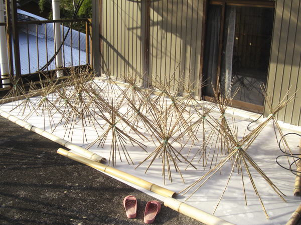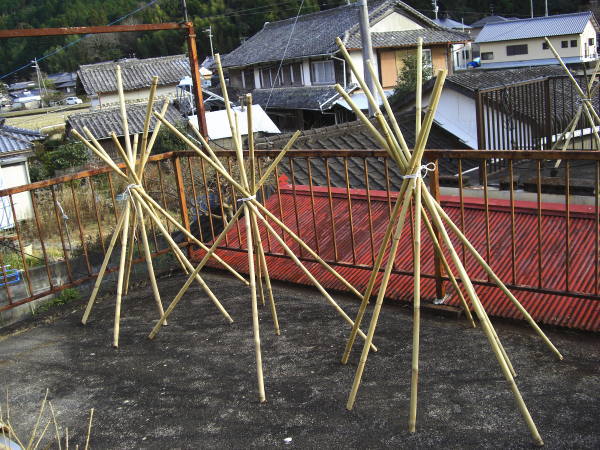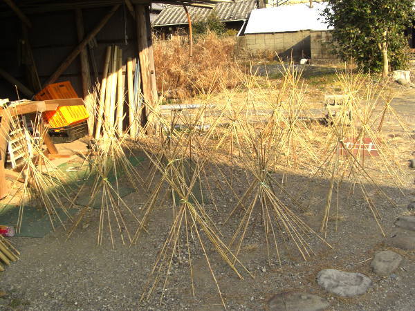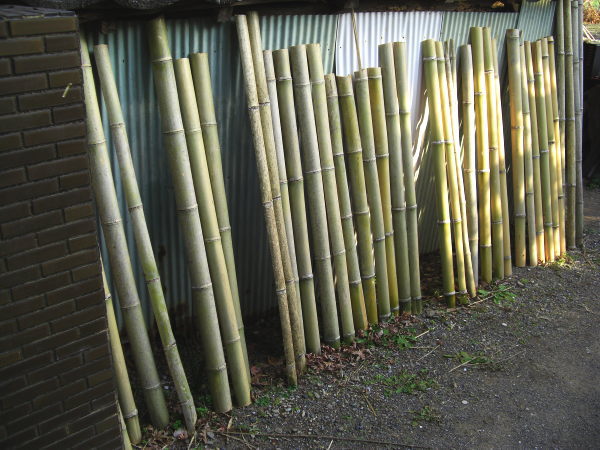 こちらは、同じく真竹の竹干しですが、竿材用ではなく間伐廃材で、布袋竹油抜きの燃料や、火入用備長炭の着火燃料などに利用しています。写真は氷山の一角で、油抜き用には毎年大量に消費してます。